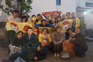 最後は、もちろん校歌とエールで締めて終了。誰かの手が杵の直撃を受けたり、杵が臼に当たって欠けたりと、多少のアクシデントはありましたが、参加者22人が、学生のようにただひたすら楽しんだ54ら会お餅つき(宴)会、場所を提供してくださった益田家の皆さまに感謝の気持ちを抱きながら、約5時間にわたる餅つき(宴)会も散会となったのでした。その後どこに寄ったのか、帰宅したのが夜中だったという人もいたようです。