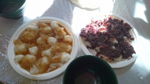 待ち構えていた調理担当が、一口大にちぎって味をつけます。真っ白なお餅は、あんこをまとい美しく装ってお皿に並びました。次々とお餅がつき上がり、納豆もち、からみ餅、磯辺巻きなどに変身。そしてどんどん54らの胃のなかへ…。他にお持ち帰り用として、ゴマ、ピーナッツ、青のりを練りこんだお餅もできました。