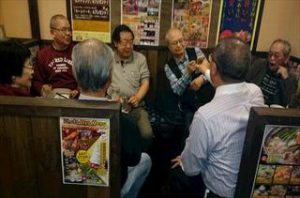 次に母校早稲田大学の初代学長をつとめた高田早苗氏の墓がある染井霊園に向かいましたが、途中霜降銀座商店街(南北線駒込駅から徒歩5分)を歩きました。この商店街が大変いい雰囲気で、自家製の魚の煮つけを売っている店や立派なセロリが280円の八百屋があり、餃子の店もおいしそうでした(お土産に生餃子を買っておけばよかったと今となっては反省してます)。巣鴨駅前で昼食の後は駒込駅に戻り、六義園に向かいました。ちょうど午後2時からボランティアの方の説明があるそうで、その前に記念撮影をしました。