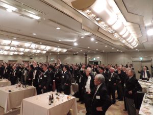 午後5時からは会場を変えて懇親会となった。校友でもある黒岩神奈川県知事、市長になる前に北川教授のマニフェスト研究所に籍を置いていたことのある福田川崎市長等ご来賓のあいさつに続き、山下名誉会長のユーモア溢れるあいさつと乾杯の音頭で懇親会はスタート。飲み放題の各種飲物と日航ホテル自慢のブッフェ料理が参加者の胃袋を満たしていく中で、当会の多奈部常任幹事が所属する東京稲門グリークラブの30名のメンバーが登壇して男声合唱のハーモニーで参加者の心を虜にした。来年の大会を開催する平塚稲門会の吉野会長へ島岡会長から大会旗の引き継ぎを行った後、応援部の男性リーダーと女性チアリーダーによるコンバットマーチで最後の盛り上げを行った後、全員で校歌を斉唱して予定通り午後7時に懇親会もお開きとなった。