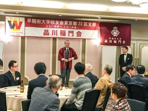 初めに塚田成四郎会長からごあいさつ。ご参加への謝辞を申し述べましたが、品川稲門会の法被(はっぴ)や3月5日(日)開催の東京都23区支部大会のご案内など、会長自らによるトップセールスタイムの様相を呈していました。司会は神野吉弘幹事長代行が務めました。