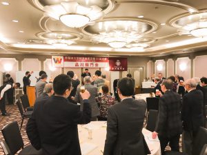 最後は木伏源太副幹事長・青年部会長の指揮で早稲田大学校歌を高らかに歌い、小林義行副会長の閉会の辞をもって楽しい新年会も散会となりました。