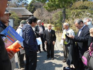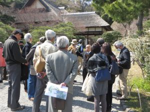 乗車したバスは車内も道路も思いのほか混雑し予定より約20分遅れて三渓園に到着。三渓園参事の川幡留司氏が案内役として出迎えてくれた。園内は外国の方も多くにぎわっていた。桜の花も見事。生糸貿易で財を成した実業家として、また茶人としても知られている原富太郎氏(号は三渓)は、明治18年に東京専門学校(現在の早稲田大学)に入学し政治経済を学び、卒業後、原家の養子となり、起伏のある広大な敷地に、歴史的に価値の高い京都や鎌倉から移築した建造物を配置した造園づくりに着手。1906年に無料公開し、また横山大観や前田青邨ら若手芸術家の育成支援にも力を注いだという。明治の財界人との交流では、茶人で電力王と言われた小田原の松永安左衛門氏(号は耳庵)や三井物産の益田孝氏(号は純翁)との朝6時開始の早朝茶会のため、彼らは横浜グランドホテルに前泊した話など、原三渓の人となり、庭園の説明、由緒ある建物の歴史を名ガイドの豊富な知識を聞きながら175.000㎡の広大な敷地のなかを春の風を浴びて歩く。重要文化財の建造物を拝見しながらの2時間半あまりの散策はかなりの運動量。久しぶりの参加の大槻俊一氏(1970年理工)は歩くより静かに空間を味わいたいと木陰でしばしのんびり待機。田中清司氏(1961年教育)は歩きながら何やら独り言、よく聞くと「流石に早稲田魂はここに生きている。目立たないが惜しみなく私財を使う」と讃えていた。