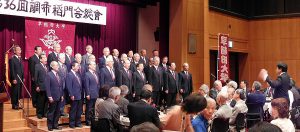 第3部懇親会は一昨年の総会でお世話になった「正直屋」さんのケータリングサービスが復活、握り鮨はじめ和洋中華の料理を楽しみながら酒が進んだ。今年もグリークラブの卒業生でつくる「東京稲門グリークラブ」に出演を快諾していただき、総勢30人の歌声が全9曲、懇親会場に雄々しく美しく響き渡った。時には静かに時には激しく、定番の『紺碧の空』を皮切りにしてロシア民謡、黒人霊歌、日本民謡などを流れるように合唱。仕上げは早慶戦に勝った時だけ歌う『早稲田の栄光』を全団員が懇親会場を取り囲んで合唱、その圧倒的な歌声は大きな感動を呼んだ。そして午後6時過ぎ、調布稲門会会員で学ラン姿に扮した応援部卒業生のリードで、全員起立して高らかに校歌を斉唱し、懇親会を締めくくった。