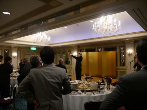 続いて、松浦幸雄氏(元群馬県高崎市長)の乾杯の音頭で懇談会に入り、新たに市長に就任した会員の自己紹介がありました。また会の中で、同日の全国市長会において第29代会長に松浦正人代表幹事が就任したことが報告され、市長会有志により記念品が贈呈されました。最後に、早稲田大学応援部リードの校歌斉唱によって散会となりました。