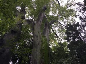 酒蔵見学後、利き酒もおいしく頂きました。文化財に指定されているという敷地内の住宅の庭園には、見事な欅の木。