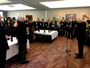 出席者は、診断士稲門会会員、来賓として中小企業診断士三田会、紫紺会や稲士会各会など44名で、盛況な会になりました。奥田社長も懇親会に参加され、熱心に質問している方々も多く見られました。締めくくりには「都の西北」を全員で斉唱し、お開きとなりました。