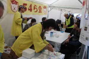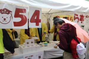 あいにく朝から雨となりましたが、予定どおりに設営完了。昨年から導入したのぼり旗もよく目立ちます。54ら亭は、テント2連仕立てで、テーブル席がありますので、雨の日には力を発揮。立ち寄ってくださった方との会話もはずみました。