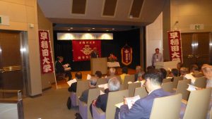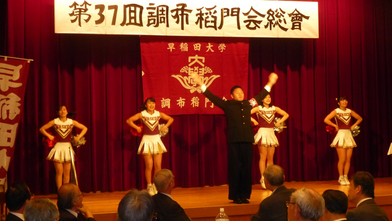 講演の余韻冷めやらぬ会場を、急いで模様替えして今度は懇親会。正直屋グループさんの出張レストランのサービスで、寿司をはじめ和洋中盛りだくさんの料理に舌鼓を打ちながら、出席者は話に花を咲かせました。今年は早稲田大学応援部リーダー(男性1人、女性4人)をお招きし、檀上でスポーツ応援さながら、応援歌に合わせて飛んだり跳ねたりの演技は圧巻でした。宴もたけなわとなり、嶋田浩一幹事が年季の入った「第二校歌人生劇場」の口演を披露してやんやの喝采を浴びました。終幕が近づいた午後7時前、締めくくりのの校歌大合唱でお開きとなりました。
