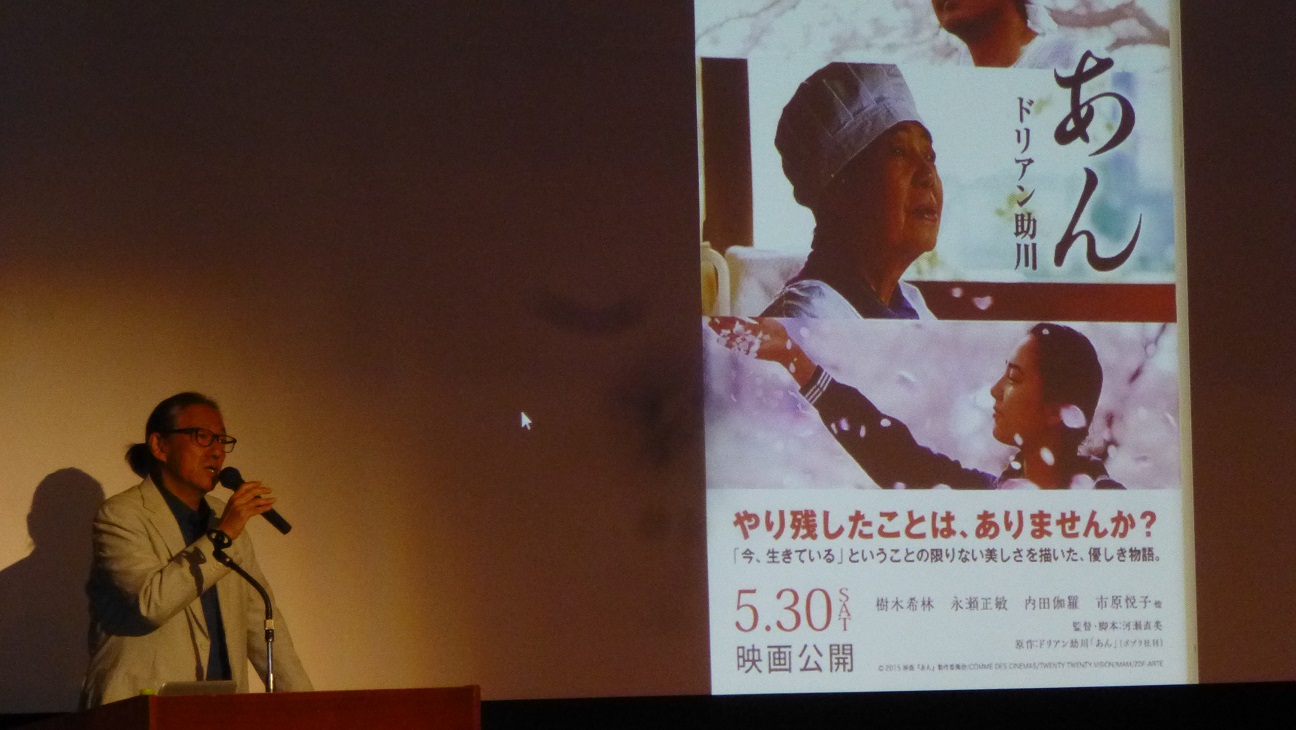 総会後、12階の大会議室に全員移動して作家ドリアン助川氏の記念講演「私たちはなぜ生まれてきたのか?小説『あん』でハンセン病回復者の人生を描いた意味」を聴きました。同氏は早大卒業生で、校友会誌『早稲田学報』の連載コラム「ドリアン助川の在野で行こうぜ!」を持っています。京王線つつじヶ丘駅近くに事務所を持ち、調布とも縁が深い人物です。講演は初めて市民への一般公開となり、山田和子副会長ら稲門会メンバーによる調布市民への積極的なPRも手伝ってほぼ満席(定員200人)となりました。ドリアン氏の卒業時の就職難の経験や職を転々とした後、放送作家として独立し、長年のテーマとして温めてきたハンセン病元患者の境遇を小説にするまでの経緯を、洒脱に滑らかにそして熱く語り、聴衆の共感を呼びました。重いテーマながら「生まれたこと自体意味のあること」をキーワードに、人間とは何かを説得力ある言葉で語りかけました。