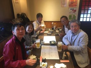 ゴルフの後は、恒例の反省会(こっちがメイン??)です。電車組はクラブバスでお店がたくさんある友部駅南口に送ってもらいました。ドライバーさんは、「日曜日なのでお店やってますかね?」などのマイナス発言。そんなはずはない。駅前の居酒屋に開店時間を早めてもらって、反省会を行いました。さすがにこの会らしい展開。その後、お酒とおつまみを買い込んで、帰りの電車で二次会。無事、東京駅でお開きとなりました。
