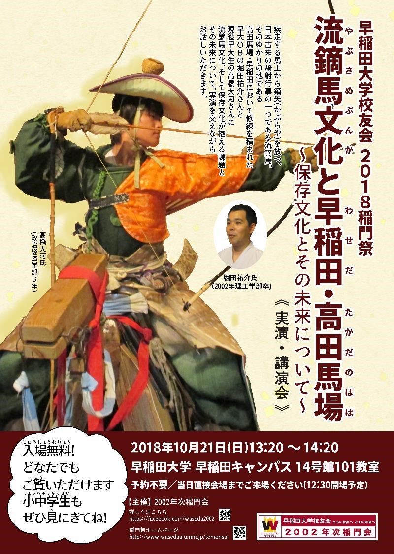 また2002年次稲門会では、2018年10月21日(日)に開催される2018稲門祭において『流鏑馬文化と早稲田・高田馬場~保存文化とその未来について~』を開催いたします。開始時間は午後1時20分より、会場は早稲田キャンパス14号館101号室となります。当日は高田馬場流鏑馬保存会で活動されているわれわれの同期の堀田祐介さん(2002年理工学部卒)、堀田さんの後輩で現役の早稲田大学の学部学生である高橋大河さんのご両名より、流鏑馬文化そして保存文化が抱える課題とその未来について、実演(予定)も交えながらお話いただく予定です。また今回の講演会および実演会は、子どもたちが伝統文化、本物にふれる機会として、小中学生のお子さまもお越しいただけます。事前の予約は必要ありませんので、お時間がありましたら午後1時20分に早稲田キャンパス14号館101号室までぜひお立ち寄りください。皆さまのご来場を心よりお待ちしております。