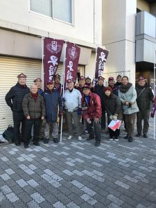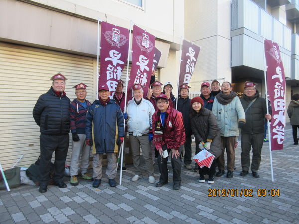 2019年1月2日午前6時45分、六郷橋のたもと。今年は期待の1年生が1区を走るのでワクワクしてのぼり旗を立て始めた綱川健一幹事長(1973年社学)。近くでは法政・中央大学も作業開始。午前7時を過ぎて吉田郁夫氏(1985年社学)、永島偉行氏(1983年法学)らも準備に加わる。三々五々メンバーも集まり、恒例のスクールカラーの紙製座布団帽子を全員に被ってもらい、応援体制も整う。静かな中に応援魂を感じさせる石渡勝朗氏(1966年教育)、元気のよい見田元氏(1974年法学)は皆に熱のこもった年始あいさつ、児玉總一郎氏(1971年教育)は完全防寒対策スタイル、自宅から40分歩いて参加の戸辺憲氏(1971年理工)は汗いっぱい、遠く川越からの細井肇氏は今年も地元銘菓を持参、ここ数年体調がすぐれなかった野口浩作氏(1963年政経)は久々の参加、駅伝応援ほぼ皆勤賞の島岡榮基氏(1965年理工)は慣れた様子で周辺への気配りも忘れない。近くの太鼓保存会の皆さんの威勢のいい太鼓の音が心地よく響く。新会計担当の曾禰純一郎氏(1973年法学)の配慮で温かいコーヒーも全員に配られた。曽禰氏と田中恭一氏(1971年理工)はファミリーで参加をしてくださってありがたい。走者のフルネーム・出身高校などの紹介を大声自慢の幹事長が披露し、蒲田通過の連絡が入ると、板橋洋一氏(1977年政経)と吉田氏の指揮による恒例の「都の西北」大合唱が始まった。「いいぞ!ワセダ!」と、通過時6位のランナーに声援を送った。皆で記念撮影後、新年早々声が枯れたと笑いながら片付けをしていると、重鎮の元応援部山下秀男氏(1959年政経)は出遅れて国道の横断規制にかかってしまい、反対側歩道で観戦せざるを得ないという痛恨のミスに苦笑い。来年もより多くの方のご参加をお待ちしています、テレビ中継にはなかなか映りませんが。
