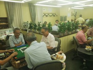 真夏の太陽が照り付ける2019年8月3日の昼過ぎ、校友会埼玉県支部西部に属する5市(志木、朝霞、新座、和光、富士見三芳)稲門会の有志による親善麻雀大会が東上線みずほ台駅そばの麻雀店で開かれました。腕に覚えの“雀士”16人が集まり、4卓を交代しながら4時間余り、わいわいがやがやと日ごろの成果を競いました。