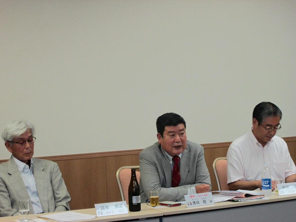 本日の講演は、清田稔氏(1968年教育)の「国際交流教育と民際外交への期待」である。会員の池田明彦氏(1976年法学)の高校時代の恩師であったことから、本日の講演となった。氏はまず神奈川県立高校の英語教師を精力的に勤め、校長として定年を迎えるまでの経歴を語った。その中で私費、公費による自らの海外研修・派遣や帰国後に外国人教員の配置など、英語教育や研修指導に情熱を注がれたことがひしひしと感じられた。続いて、神奈川県や川崎市と国際交流のあるメリーランド州で小中高生に日本語・日本文化を教えた1年間の経験を踏まえ、両国の学校教育や生活の違いも語った。子供の頃から自立心を高めて育ち、ディベート(異なる立場の討論)の教育によって、自己表現力が磨かれており、気質の違いを痛感したそうである。これには参加者の海外経験者も同様な意見を述べた。日本の生徒は優秀ではあるが、従来の大人しさや奥ゆかしさではなく、自分の意見を表現し、日本文化を発信する必要性を説いた。これにはすでに日本の私学では試みもなされているという意見もあった。全体を通じて、教育者自らの自戒の念として語った「教科書を使って教えるのではなく、教科書を教えてしまう」という言葉は、日本の教育全般に通じるとても印象的な言葉だった。