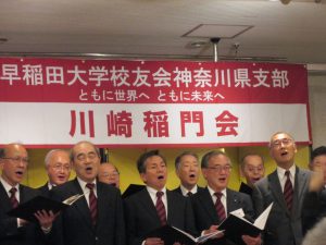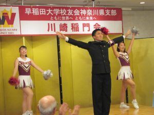 平沢和久顧問の乾杯でにぎやかに懇親会が始まり、写真担当の坪井武信氏も忙しい。来月の県支部大会主管の厚木稲門会・伊保朝夫副会長からは奮っての参加要請があった。藤沢稲門会・内田進会長からは、本日の箱根駅伝予選で本戦出場の決定が報告された。初参加者・現役学生の自己紹介に続き、ワセダサロンや各同好会の紹介を担当役員が行った。多奈部純一氏率いる東京稲門グリークラブの21人が登壇、見事な男性コーラス7曲は会場を圧倒した。会も終盤、福引抽選会へ。司会は見田元氏と能智和美氏、補佐役は若手の木村友紀氏。7割以上の人に景品が当たるため、番号読み上げのたびに歓声が。笑顔あふれる会場も応援部の登場でさらに盛り上がり、全員で校歌斉唱。川崎三田会へのエールは板橋洋一氏のリードで『若き血』も斉唱。最後は井上勝利副会長の閉会のあいさつと手締めでお開きとなった。