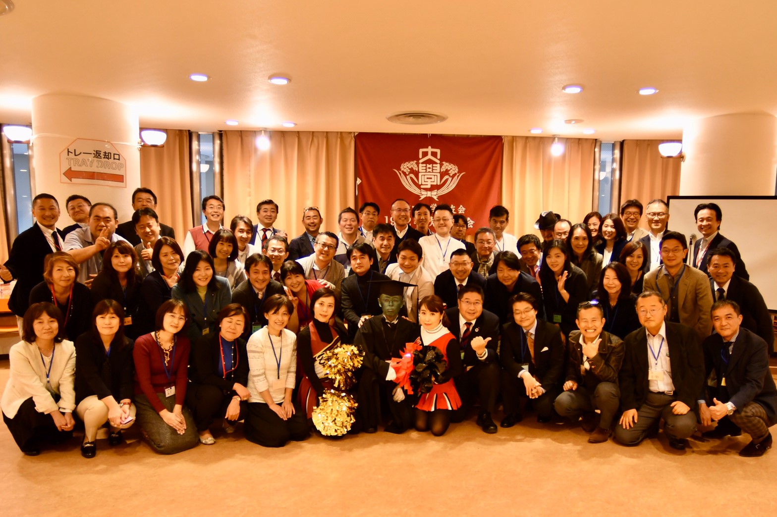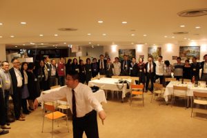 続いて記念写真の後、お待ちかねの懇親会へ。ここからの出席の方を加え62人にて、中野実君の乾杯で開会し、出身地別のテーブルに分かれ当時・現在とも話に花が咲く中、恒例のゲーム大会に突入。100円玉争奪ジャンケンに懐かしの「ジェンカ」を組み合わせ、曲のテンポアップもあって大いに盛り上がりました。その一体感のままに、92恒例の応援部出身者による応援曲メドレーへ。今回は同期リーダー4人、チア2人により、あの頃そのままの名調子、名演技で一体感は最高潮となり大団円となりました。