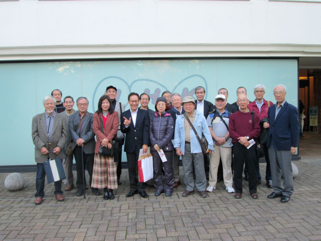 絶好の秋晴れの散策日和となった、2019年11月17日午後1時半に地下鉄御成門駅出入口前に総勢19人が集合。愛宕山にあるNHK放送博物館に向かう。愛宕トンネル手前の階段やエレベーターで博物館へ。井上副会長の同僚だった荻原放送博物館長の案内で展示品についての丁寧な説明を受ける。約3万件の資料を所蔵し、順次公開する中でも、命がけだった玉音放送の原盤にまつわる展示品に歴史の重みを感じ、圧倒される思いであった。他にもテレビ放送初期の機器類、大河ドラマ『いだてん』にまつわるオリンピック放送の資料や、思い出深い映像に時の流れを感じ、改めて映像技術の進歩を目の当たりにできた。模擬アナウンサー体験、海中の魚との8K映像など、各自様々な思いを胸に館内を見て回り、あっという間の2時間であった。帰り際に博物館前で記念写真を撮影。その後に愛宕神社、青松禅寺、増上寺で荘厳や静寂さを感じて参詣し、京急川崎に戻って懇親会で打ち上げ、散会となった。