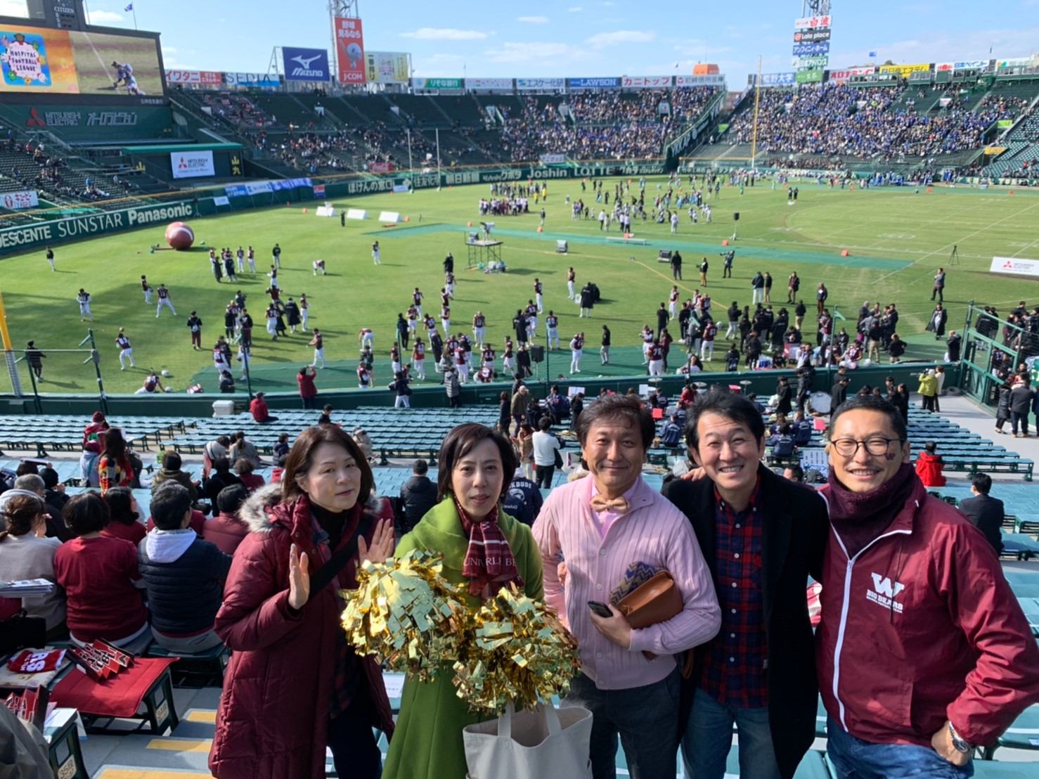 2019年12月15日、昨年に続き今年も聖地へ乗り込んできた、早稲田大学アメリカンフットボール部「Big Bears」全日本大学アメリカンフットボール選手権決勝「三菱電機杯第74回毎日甲子園ボウル」。関西からは、1992年次は4人、東京からは多くの同期卒業生を中心とした早稲田人が集まった。また、大阪早稲田倶楽部はじめ多くの関西稲門会参加者が200人以上の観戦。一般ファン、父母関係者もそろい、昨年の雪辱を果たすべく、三塁側アルプススタンドは気が付けばほぼ満員の早稲田カラー。対面する青の関学スタンドに引けを取らない応援団となった。同期高岡監督率いるアメリカンフットボール部を力をこめて応援した。