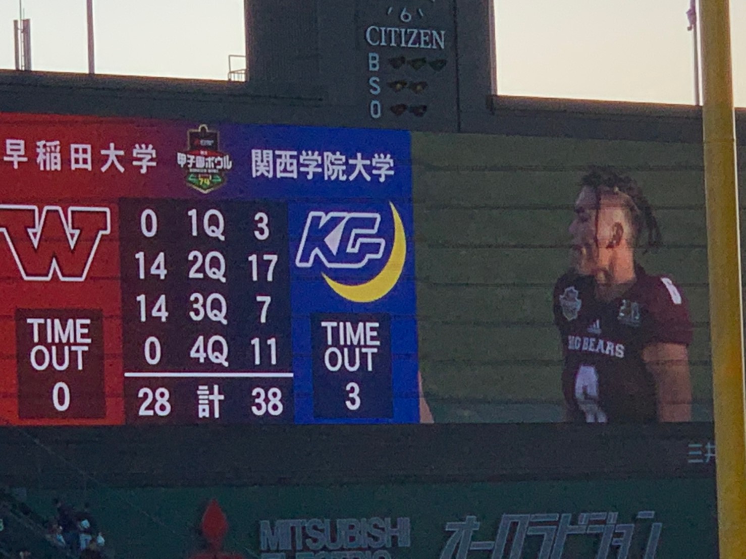 3Q:やっぱり強い関学大をおいかけて、早稲田のプレーも柔軟で、息をつかせぬ展開。3Q終了間際に、WRブレナン翼が関学大を振り切りパスを受け、そのまま駆け込みTD28-27と再逆転に成功した。「行ける!」。
