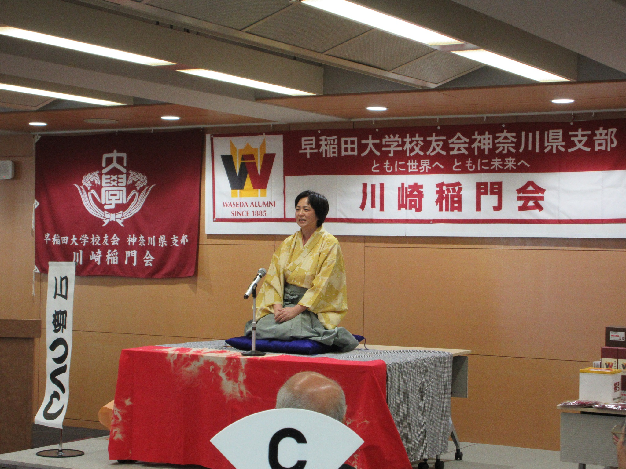 続いて稲門出身の女性落語家の川柳つくし氏が出囃子に乗って登場。「創作落語 早慶戦」は満場の大受けだった。