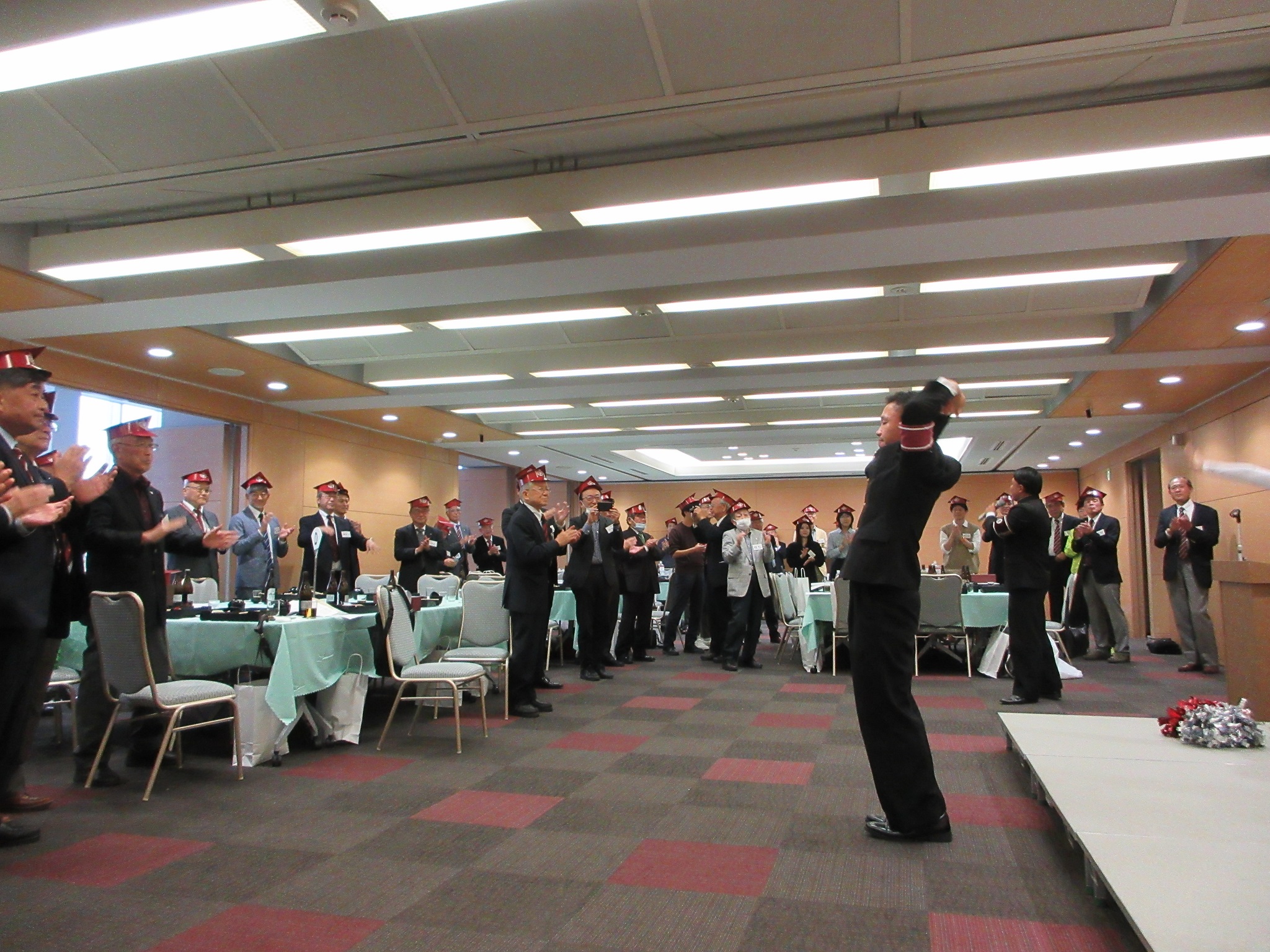 続いて応援部のリーダーとチアーが登場して華やかに演じ、校歌斉唱。最後は平沢和久顧問(1962法学)の閉会のあいさつで、盛会のうちにお開きとなった。