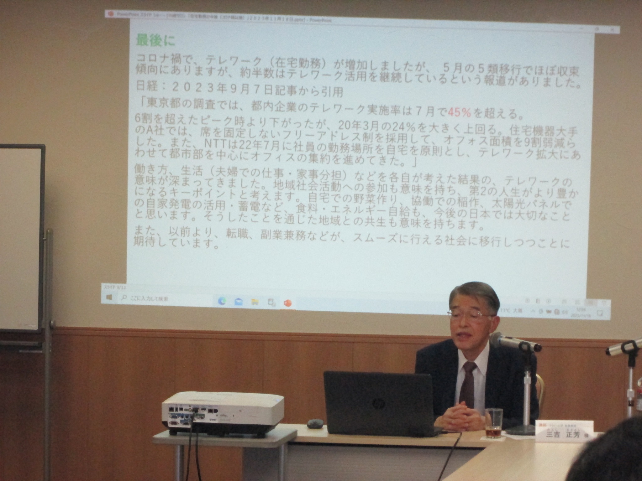 参加者からは、「通勤時間は減ったが、通信費、セキュリティ対策費、光熱費などは増えた」「建設業では、間接部門の業務形態は大幅に変わったが、直接部門の現場はあまり変わっていない」「持ち出せない個人情報を扱う仕事では、出社せざるを得ない」などの意見が出た。最後に講師は、地域の活性化や雇用、人や社会・環境に配慮した「エシカル消費」について簡単に触れた。