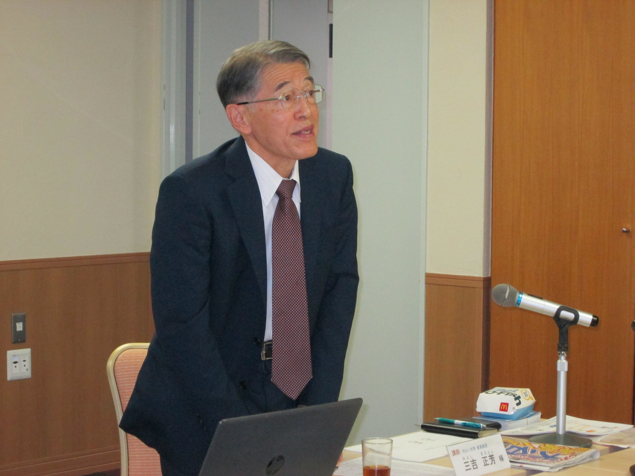 本日の講演テーマは「在宅勤務の今後(コロナ禍以後)」で、講師はサイバー大学客員教授三吉正芳氏(1973政経)。三吉氏は越智相談役(1966理工)が幹事長の時に、横浜の幹事長同士のつながりで知り合い、以前の講演に続いて今回も講師を務めることになった。
