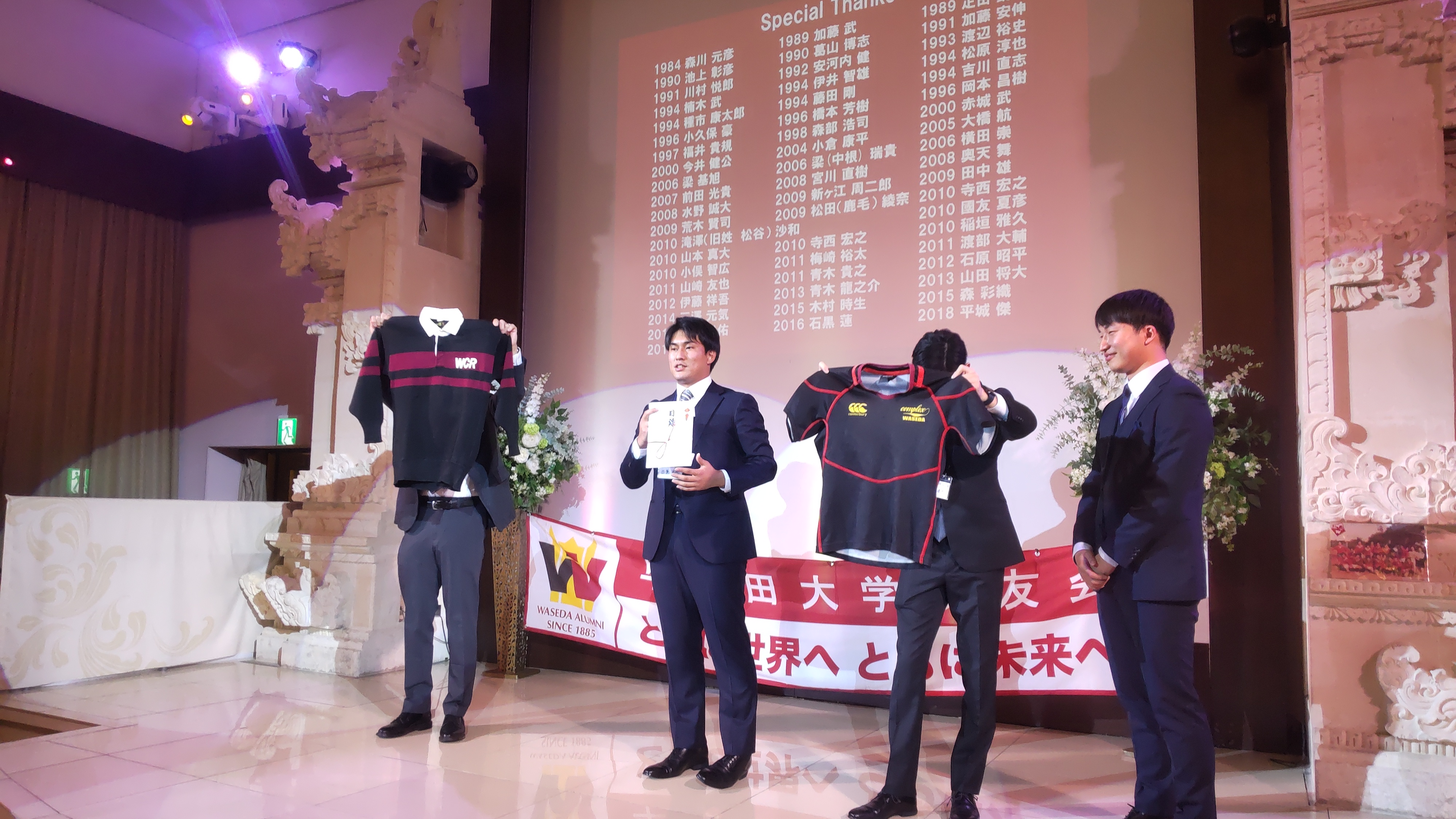 日本を代表するクラッシックギタリストである松尾俊介氏による祝賀曲演奏があり、日本体育大学教授兼ラグビー部長で、1980年代の早稲田ラグビー部レギュラーとして秩父宮・国立を沸かせた松瀬学氏の「ラグビーのあれのアレ」と題した講演が行われました。
