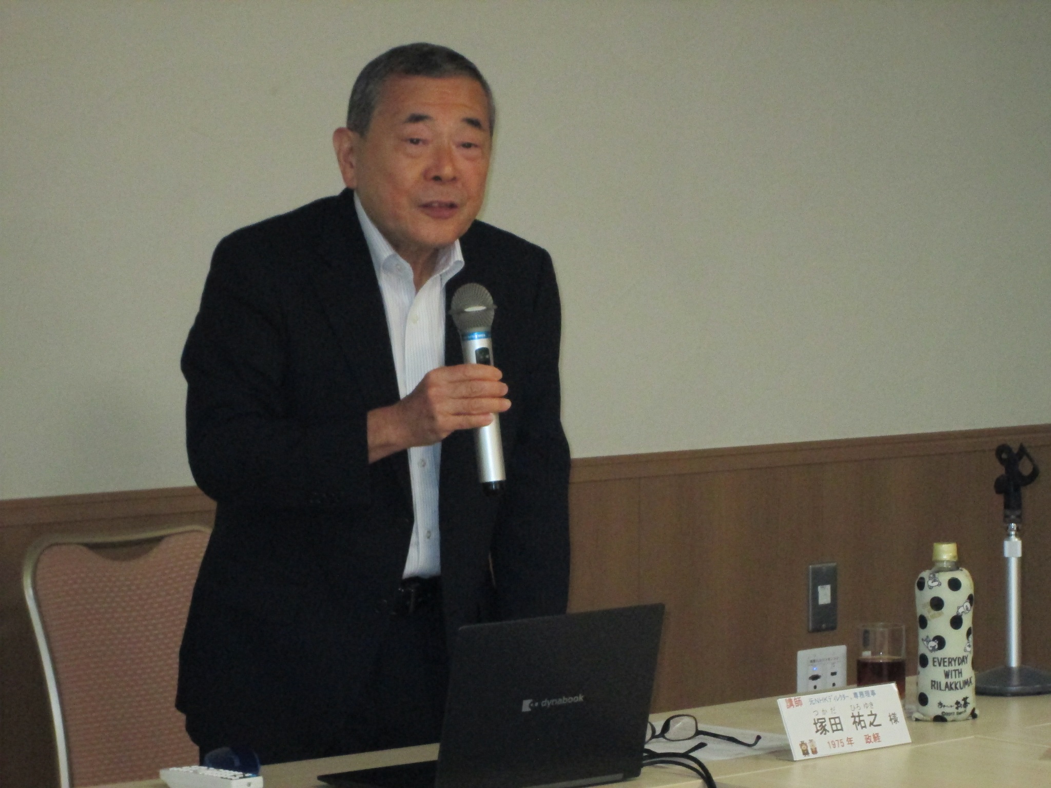 本日の講演者は、元NHKディレクター・専務理事の塚田祐之氏(1975年政経・当会会員山本哲也氏と同じゼミ、NHK同期)である。テーマは「その情報、本当ですか?―SNS時代の情報の読み解き方―」である。在学中(1971~75年)は大学紛争の最中で授業がないので、全国を旅してさまざまなことを目にしたのが、NHKで番組作りを志望した動機と述べ、地方局及び東京で報道番組の制作に関わり、後に広報局長、専務理事等を務めたと紹介した。端末さえあれば、誰でもが情報発信出来るSNS社会、蔓延する偽情報については、元日の能登半島地震では「#助けて~」「#SOS」「人工地震」など、2016年6月の熊本地震では「動物園のライオンが放たれた」、コロナ禍では「トイレットペーパーが中国産なので店頭からなくなる」などの拡散事例を説明した。