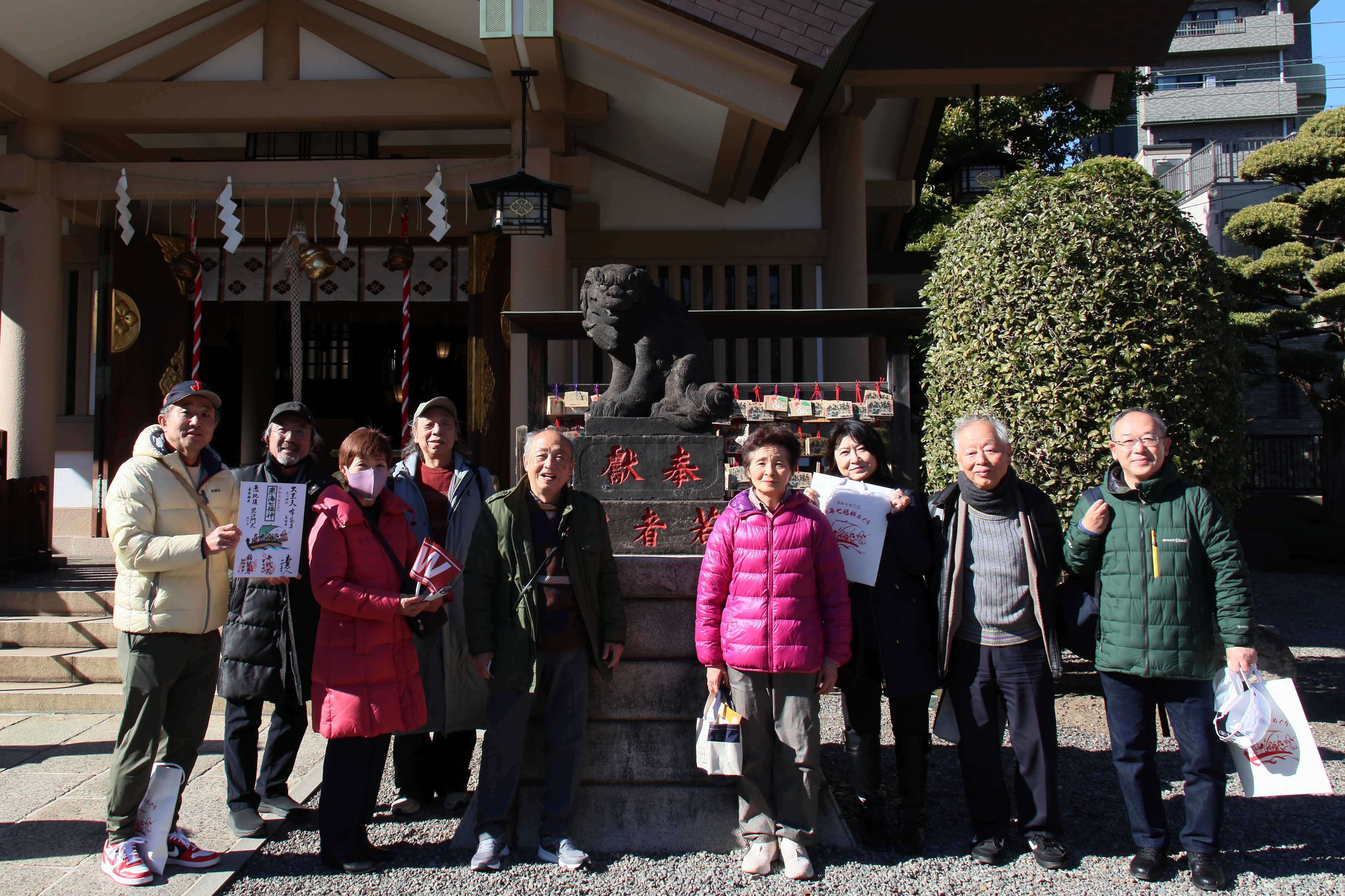 新春恒例の品川稲門会の七福神巡りは、地元品川区と大田区にある寺社を巡る東海七福神巡りです。実施日の2025年1月11日(土)は、朝から晴天に恵まれ、参加者9人は新春の旧東海道沿いにある神社・寺を巡りました。