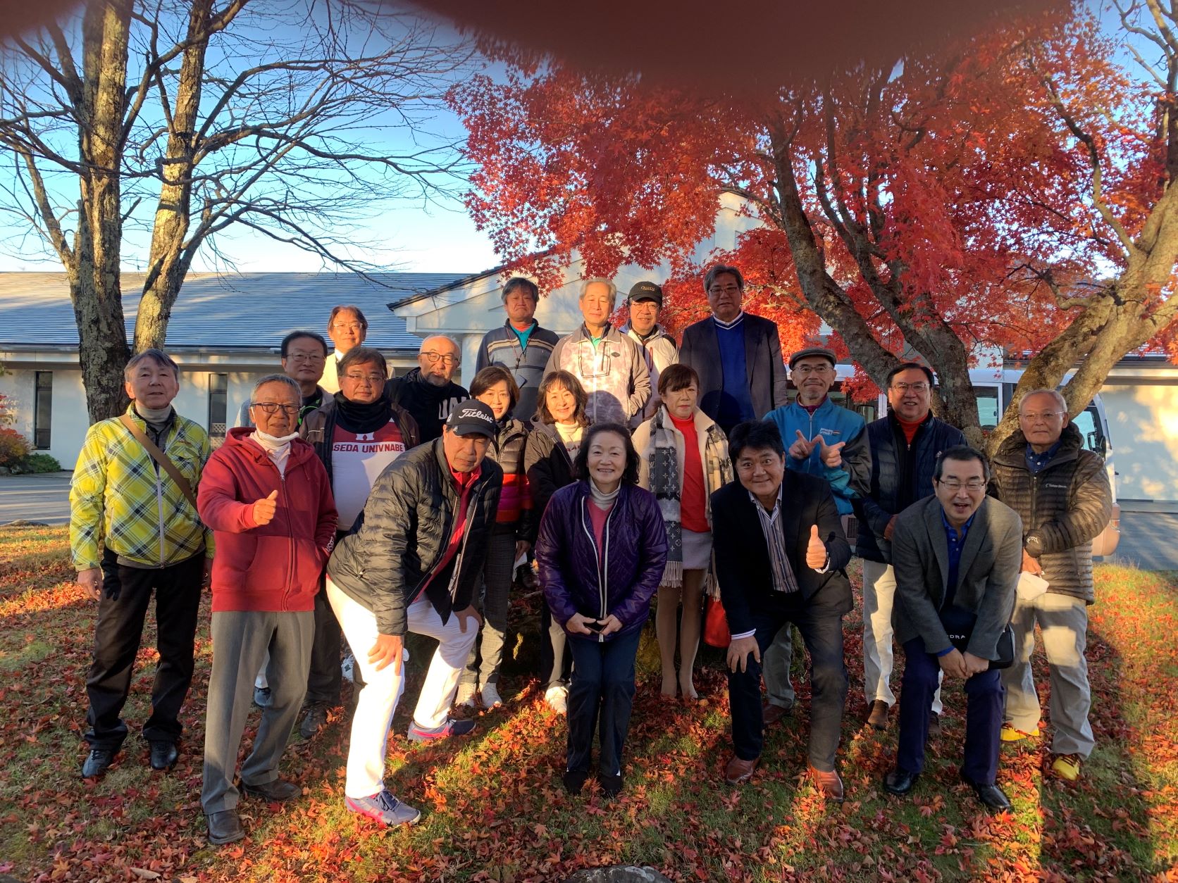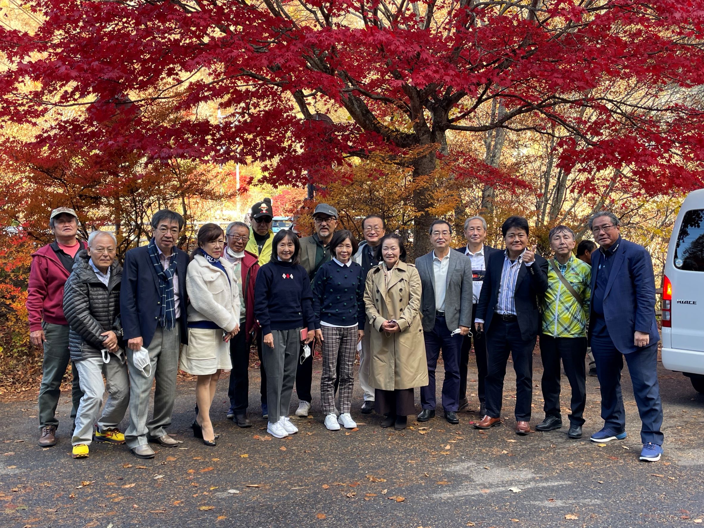 秋田県や兵庫県からの仲間を含めて過去最多の20人が参加。ゴルフ場への日塩もみじライン途中にある白滝では、クラブバスを停めてもらい、紅葉真っ盛りをバックに記念撮影。日頃の行いの良さが効してか、雲一つない晴天の下で2日間ゴルフを享受しました。ゴルフ場でも紅葉、そして夜は満点の星空を満喫しました。