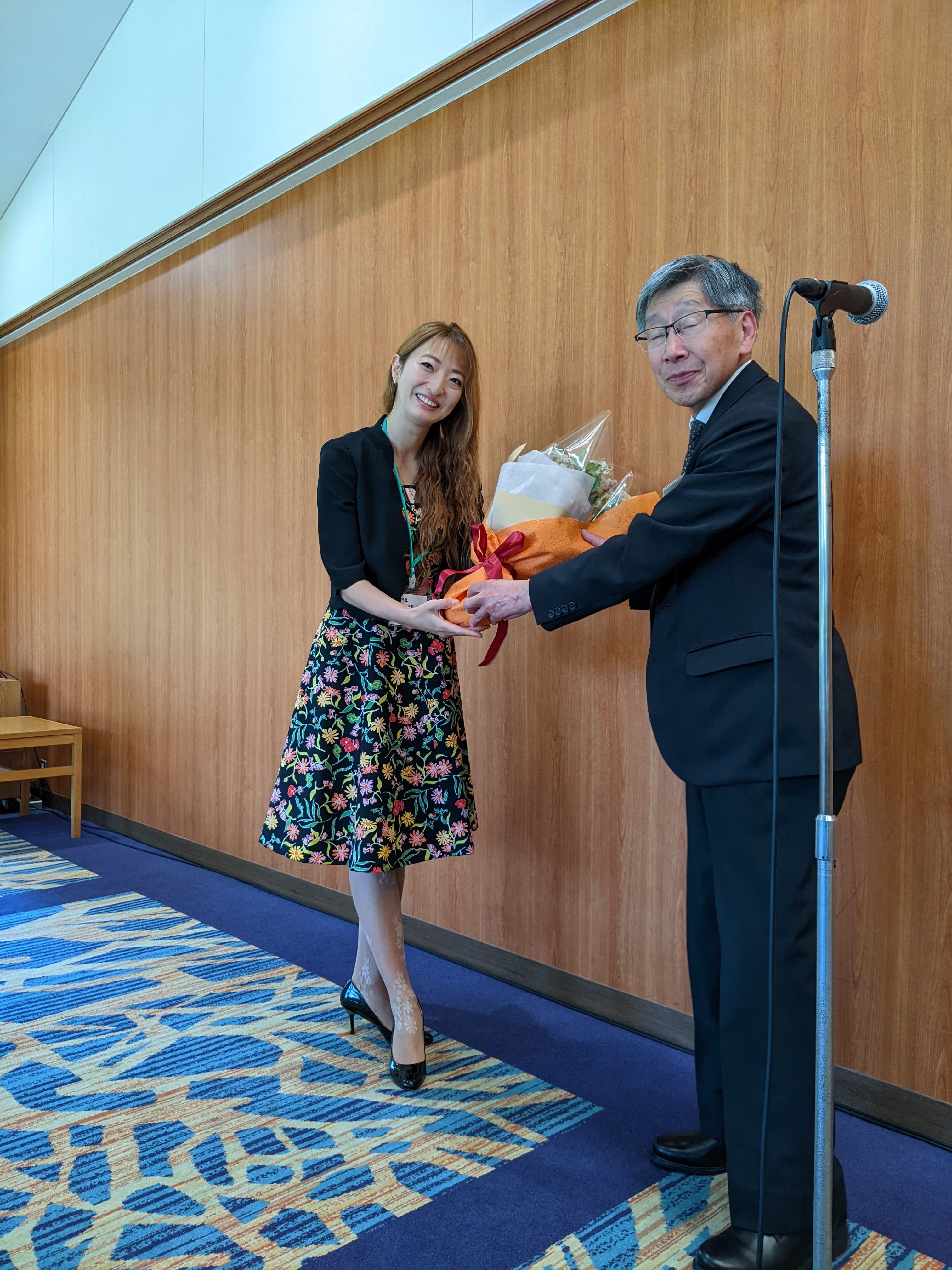 交流会の冒頭では、1月の軽井沢町長選挙で激戦を制し、地元軽井沢町長に就任された土屋三千夫さんから、ごあいさつを頂きました。退任された宇野前会長には、元タカラジェンヌという経歴の中沢恵璃香さんから花束が手渡されました。