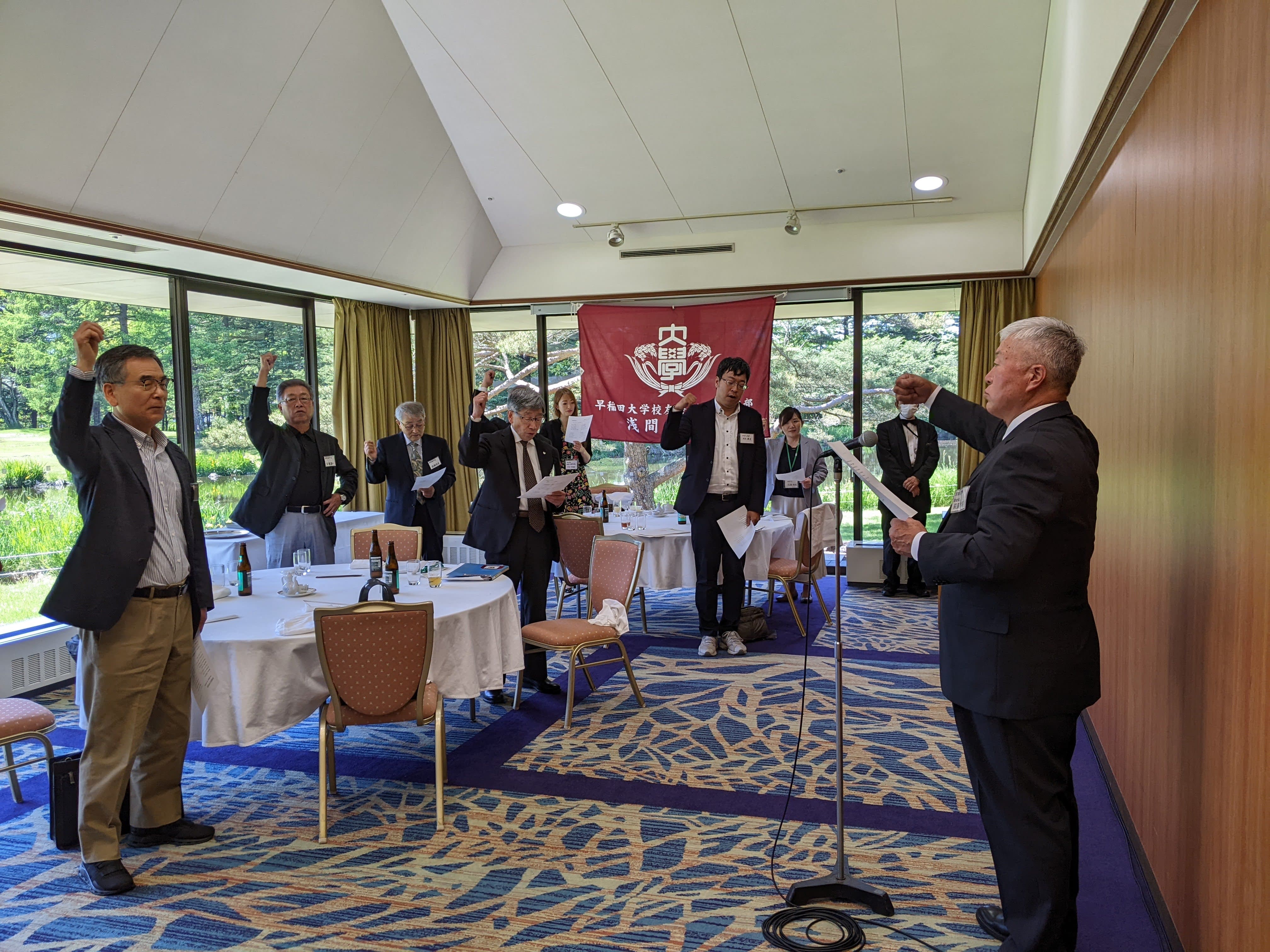また現役時代早稲田混声合唱団に所属し、ドリフの全員集合の聖歌隊でも活躍した萩原新会長からは、テノールのアカペラで『早稲田の栄光』が披露され、参加者一同素晴らしい歌声に酔いしれました。