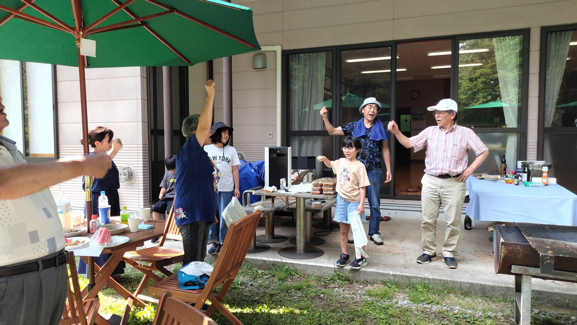 長野県支部浅間稲門会のBBQ懇親会 in 軽井沢が、7月23日(日)12時から、軽井沢町千ヶ滝滝西区公民館の庭で開催されました。参加者は会員13人、会員の配偶者1人・子どもの小学生2人・孫の小学生1人の計17人でした。