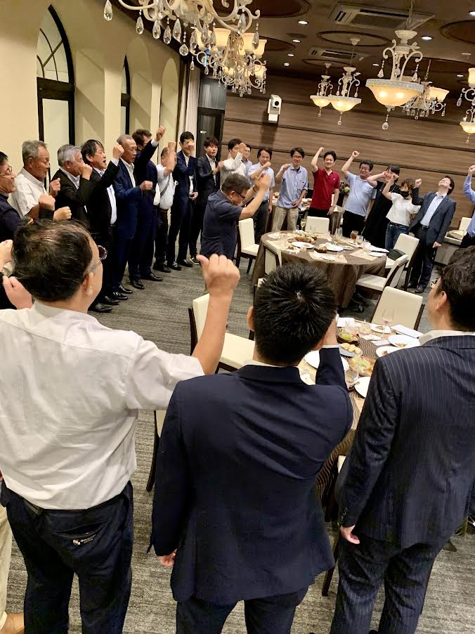 近藤清志(1984年政経)副会長のあいさつ、一本締めの後、松本吉弘さん(1979年政経)を中心に円陣となり、校歌を歌い、散会しました。