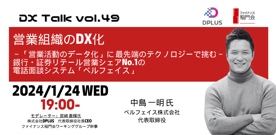 オンラインセミナー「営業組織のDX化~『営業活動のデータ化』に 最先端のテクノロジーで挑む~銀行・証券リテール営業シェアNo.1の電話面談システム『ベルフェイス』~DX Talk Vol.49」開催