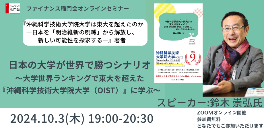 ファイナンス稲門会:オンラインセミナー「日本の大学が世界で勝つシナリオ~大学世界ランキングで東大を超えた『沖縄科学技術大学院大学(OIST)』に学ぶ~」10/3(木)開催