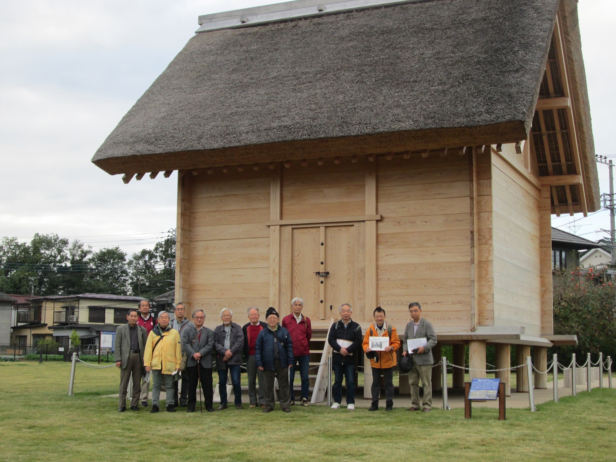 一連の文化財の見学後、古代三重塔の心礎の影向石の前で学芸員の方の説明を聴き、古代に思いをはせると共に、遺構発掘の大変さや遠大さを改めて感じた。影向寺を後に歴史公園となっている橘樹郡家跡に向かう。園内の穀物収納庫と考えられる復元した高床倉庫や説明版等を散策しながら見学した。
