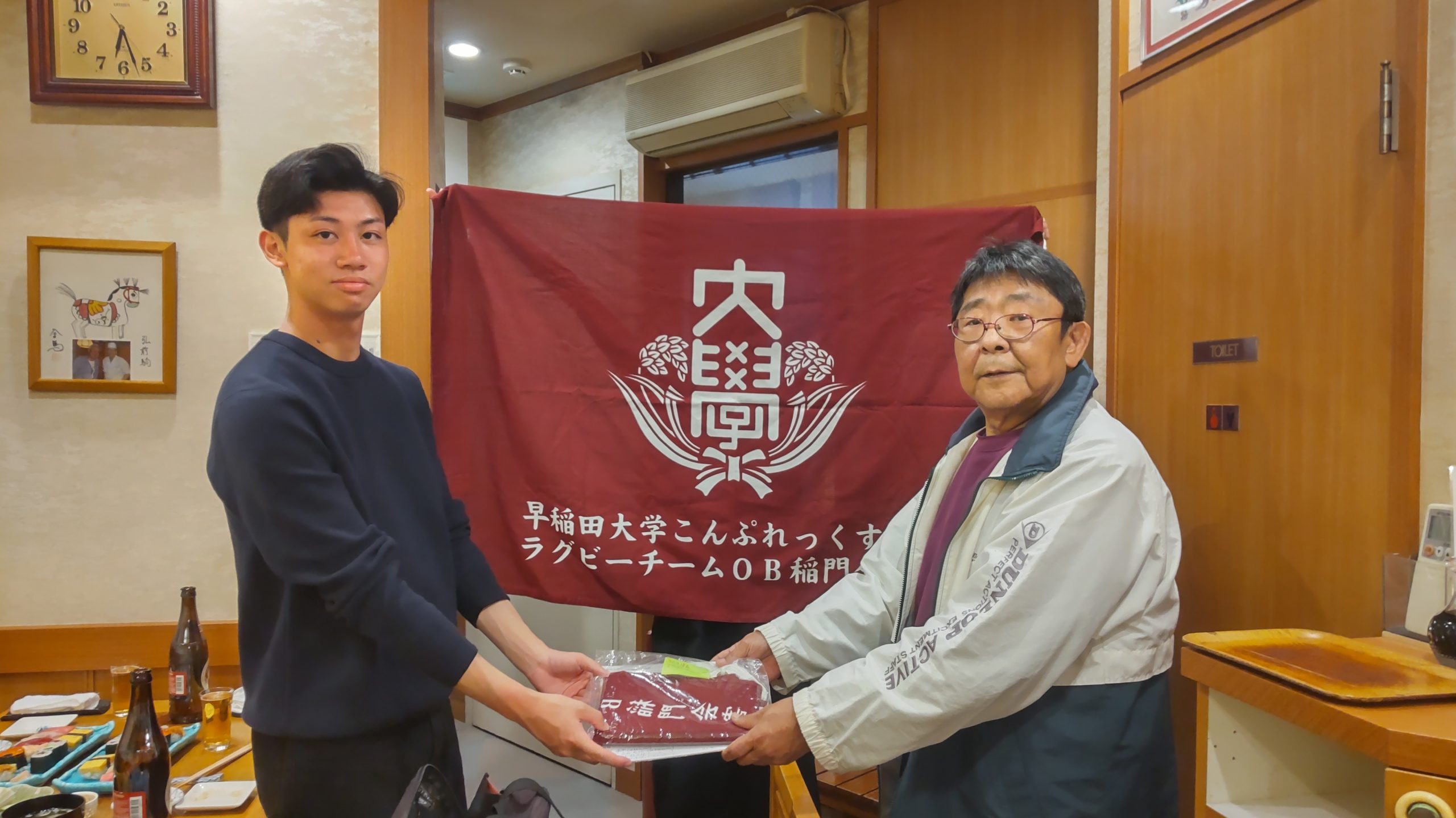 早稲田大学こんぷれっくすラグビーチームOB稲門会では2025年4月28日(月)、同稲門会有志寄付で作成したサークル旗(二代目)の返還式を早稲田の「八幡鮨」で行いました。会長の私が仲介役となって、2024年度キャプテンの川下君からサークル旗を返還してもらう行事です。川下君は人柄も良く、現在就職活動中とのこと。誰もが知る有名企業への就職が内定しそうな様子です。ほかの就活中の部員も皆、一流企業に内定とのこと。卒業生としては非常に嬉しい次第です。(写真・上)