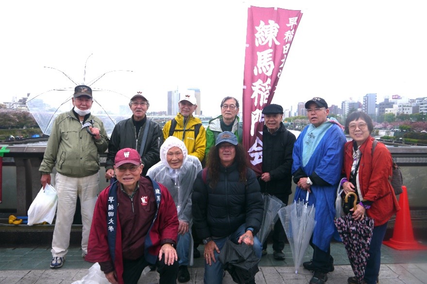 練馬稲門会のワセダスポーツを楽しむ会では、2025年4月13日(日)に第94回早慶レガッタ応援観戦を行った。毎年、4月中旬の天気は良くない。この日も雨が降る中、12:40ごろ、桜橋の中央に到着。雨カッパを着ながら、練馬稲門会の幟(のぼり)を立てて会員を待つが、雨のせいか会員がなかなか現れない。やっと13:30ごろから徐々に集まり、用意していたコップ酒を飲みながら、レースを待つ。毎年、総長が桜橋の中央を通り過ぎる際、一緒に写真撮影をするが降雨のため、今回は中止。だが、地元の墨田稲門会の方が一升瓶を抱え、われわれにお酒を振る舞ってくれた。雨が降りしきる中、レースはスタート時に両挺が接近してぶつかるアクシデントがあり、再スタート。仕切り直しのレースではフィジカルの強さがある早大クルーはスタート時から慶大クルーを圧倒、蔵前橋付近で約8秒の差をつけ、言問橋過ぎに両艇が見えると、早大クルーが慶大クルーを大きく離し、ゴールの桜橋では5挺身差で早稲田の優勝。応援観戦後、「清龍高田馬場店」にて祝杯を挙げた。