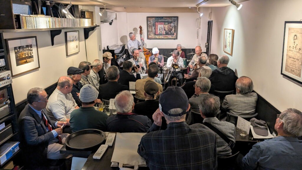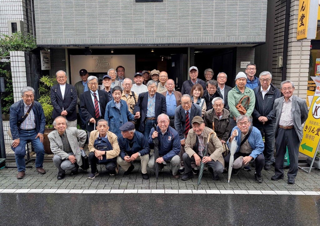 2025年5月30日(金)、恒例になった「Ninety West Jazz Band」の演奏を楽しみました。メンバーが早稲田大学ニューオルリンズジャズクラブ(1957年創立)校友で全員80歳以上というバンドは、今回もエネルギッシュで疲れ知らず。『サニーサイド・オブ・ザ・ストリート』や『セントルイス・ブルース』などの名曲の数々の熱演に会場内が一体となって盛り上がりました。過去最多の参加者数30人で会場のライブハウスは満席、ドリンクをたしなみながらの手拍子や歓声で終始熱気に包まれていた1時間半でした。終了後、小雨の中で集合写真、その後の有志による懇親会にも多くの人が参加しました。