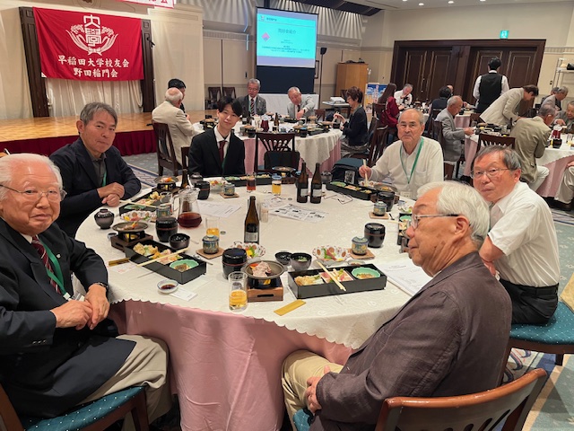 その後の懇親会では、来賓の早稲田大学 津久井様、千葉県支部 副支部長および流山稲門会 会長 高橋様、我孫子稲門会 副会長 山本様より祝辞をいただき、小川前会長の乾杯でスタートしました。また、今年は早稲田大学現役学生2人が早稲田祭のPRに来てくれて、フレッシュな会となりました。その後、各同好会からの活動プレゼン、引退役員を代表して市村元監査役からのごあいさつ、早稲田大学校歌斉唱を経て渡邊副会長の閉会のあいさつで締めました。30周年と「みんなでつくる楽しい野田稲門会」を目指して、これからも頑張ります。お集まりの皆さまに感謝申し上げます。