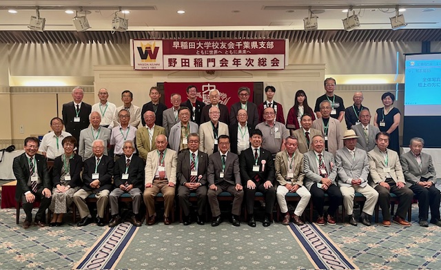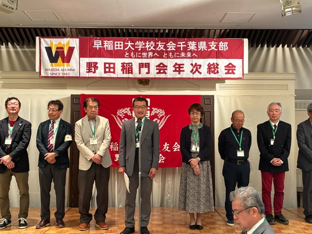 2025年6月14日(土)に第21回野田稲門会総会が無事開催されました。当日は34人の会員にご来賓の方々、早稲田祭実行委員の学生合計39人の参加で行われました。総会では役員任期中ではありましたが、昨年の20周年行事の成功を糧に30周年へ向けての新体制づくりを目指して、8人の旧役員が後任に席を譲り、新役員体制および方針・予算が承認されました。