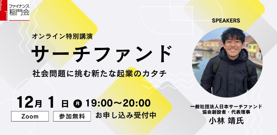 ファイナンス稲門会:オンラインセミナー「サーチファンド:社会問題に挑む新たな起業のカタチ」を12/1(月)開催