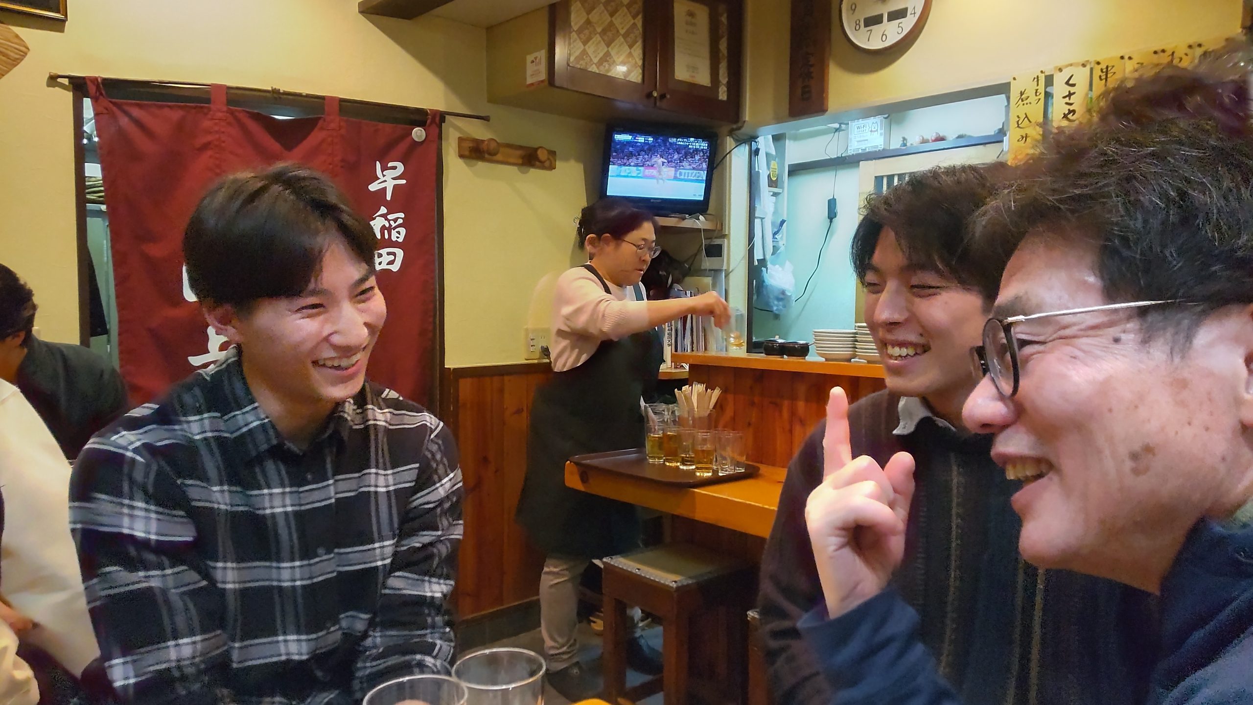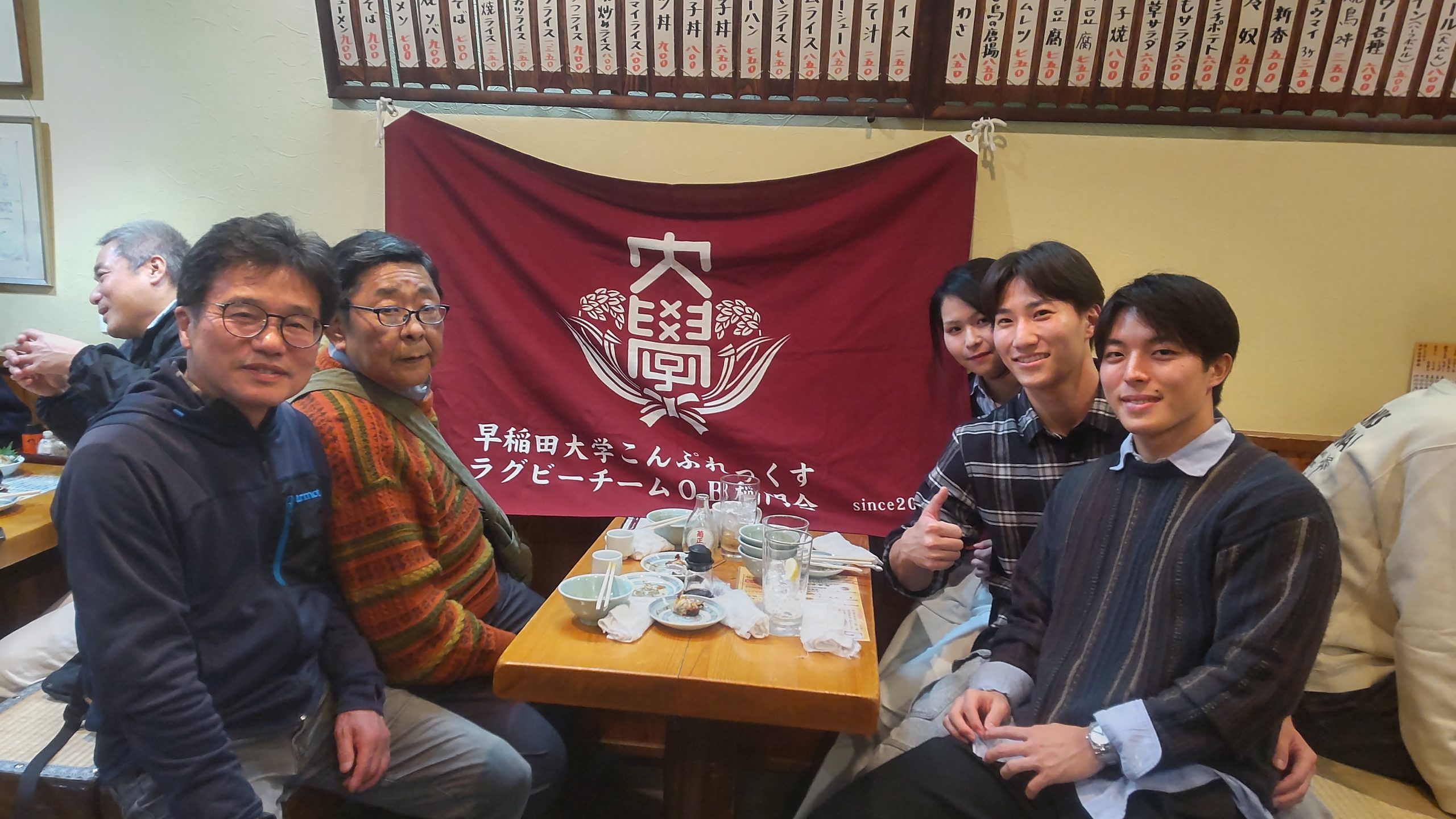 わが早稲田大学こんぷれっくすラグビーチーム現役が「関東学生クラブラグビー選手権大会」にて1部昇格が決定しました。OBOGとしても非常に喜ばしいことです。1部昇格が決定したため、会幹部と現役幹部にて、ささやかなお祝いの会を2025年12月6日(土)、早稲田の名店「源兵衛」にて催しました。お祝いの会は、できれば現役諸君全員招いて催したかったのですが、予算の関係で幹部だけとの会としました。参加者は現役からは 髙木キャプテン、原山幹事長、長沼マネ長の3人。OBOG稲門会からは会長の井上と副会長の後藤君の2人。総勢5人のコンパクトな会でした。