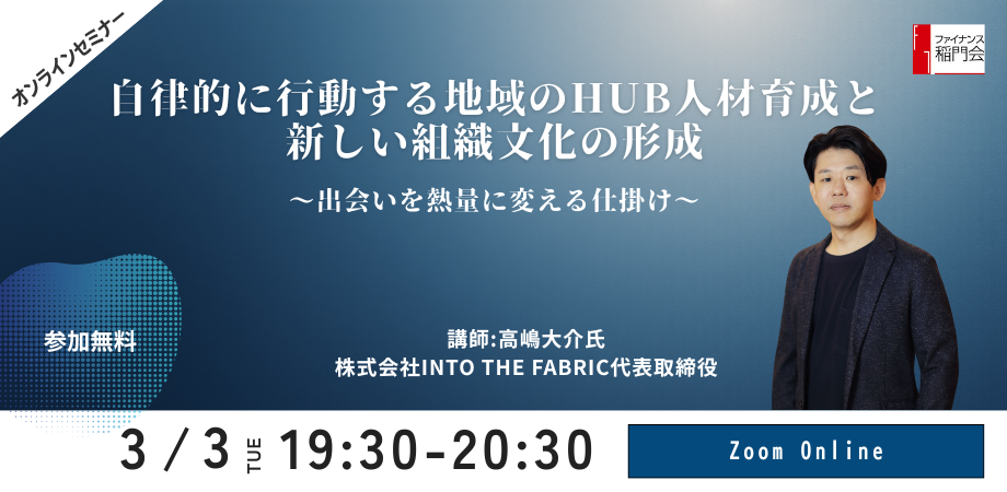 ファイナンス稲門会:オンラインセミナー「自律的に行動する地域のHub人材育成と新しい組織文化の形成~ファイナンス稲門会~」3/3(火)開催