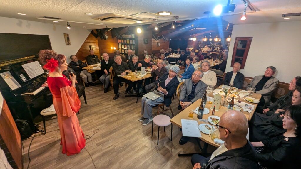 好天と春風の2026年2月28日(土)、「ラテン&シャンソンの夕べ」を開催しました。会場となった荻窪のJUNONに43人の皆さまにお集まりいただき、盛会となりました。会話が弾む会半ばの19時、早稲田大学文学部卒業の歌手、山口蘭子さんのショータイムがスタート。プロ司会者の稲垣文子さん(第5ブロック)のご案内で華やかに幕を開け、山口蘭子さんにラテン・タンゴ、シャンソンなど多彩な曲を歌っていただきました。