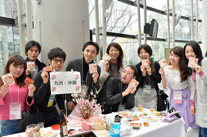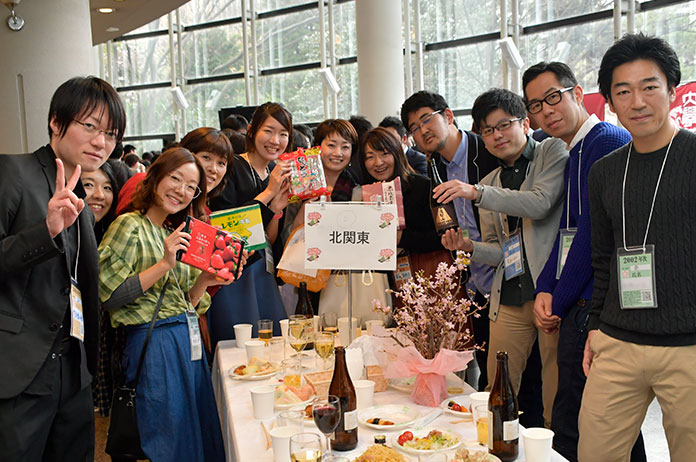 食事と会話を一通り楽しんだ後は、出身地ごとのグループに分かれて歓談がスタート。テーブルには各地の地酒とお菓子が用意され、参加者それぞれが自身にゆかりのある味を楽しみました。