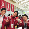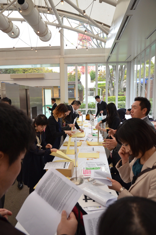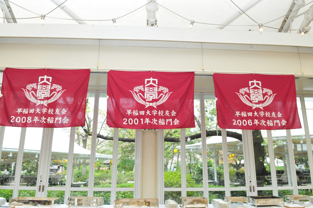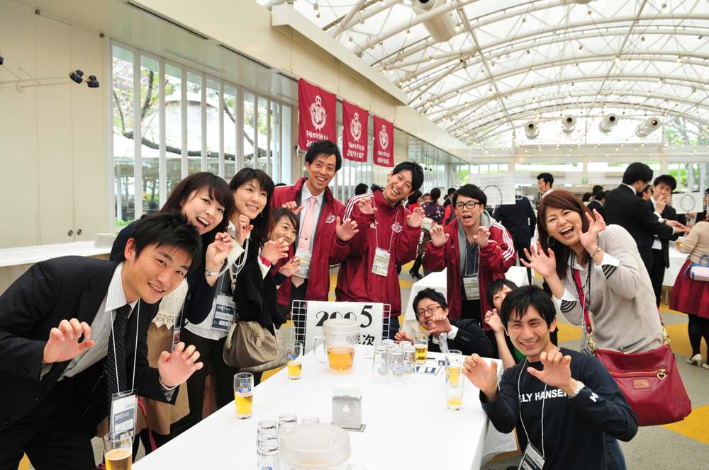 まず始めは、年次ごとのテーブルに分かれて立食。懐かしい友との再会や、新たな出会いに会場のあちこちから笑い声が聞こえます。2010年次稲門会はオリジナルジャンパーを作成。発足間もない稲門会ということで、気合が入っています。